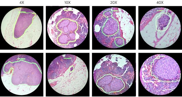 为了演示增强现实显微镜的功能,我们让其运行两种不同的癌症检测算法:一种用于检测淋巴结标本中的乳腺癌转移,另一种用于检测前列腺切除术标本中的前列腺癌。这些算法可以在4-40x的放大倍数下运行,并用绿色轮廓勾画出检测到肿瘤区域。这些轮廓可以帮助病理学家注意到感兴趣的区域,而不至于遗漏外观模糊的肿瘤细胞。