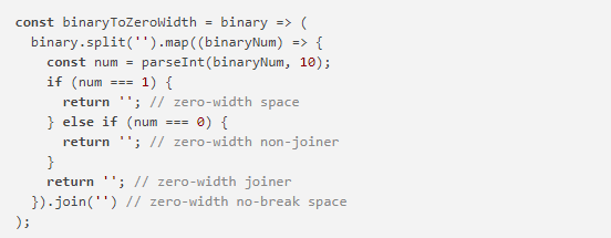 2 把这些经过二进制转换的用户名字母转换为零宽度字符。该过程中,二进制串中的每个1转换为零宽度空格,每个0转换为零宽不连字符(zero-width-non-joiner),每个字母完成转换后再在其后面加上一个零宽连字符(zero-width joiner ),然后再对下一个字母进行类似转换。