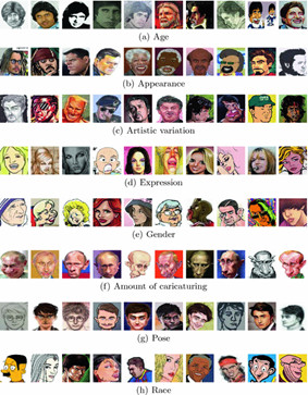 这一数据集中包含了8928张带标记的卡通人脸图像,其中不仅包含了不同年龄、性别、情感的基本人脸数据,同时还包括各个人种、人脸位置以及讽刺隐喻等高维度信息,其标注信息示例如下,包括了七个特征维度和包括角色名字的五个人脸位置维度信息:
