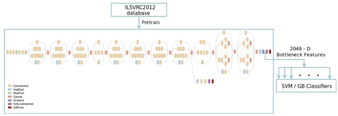 对于人脸识别工作,研究人员们提出两种方式,第一种是利用Inceptionv3+SVM来进行识别,首先利用Inception来高效抽取图像特征,并在最后使用分类器来对最终2048维结果进行分类实现识别。