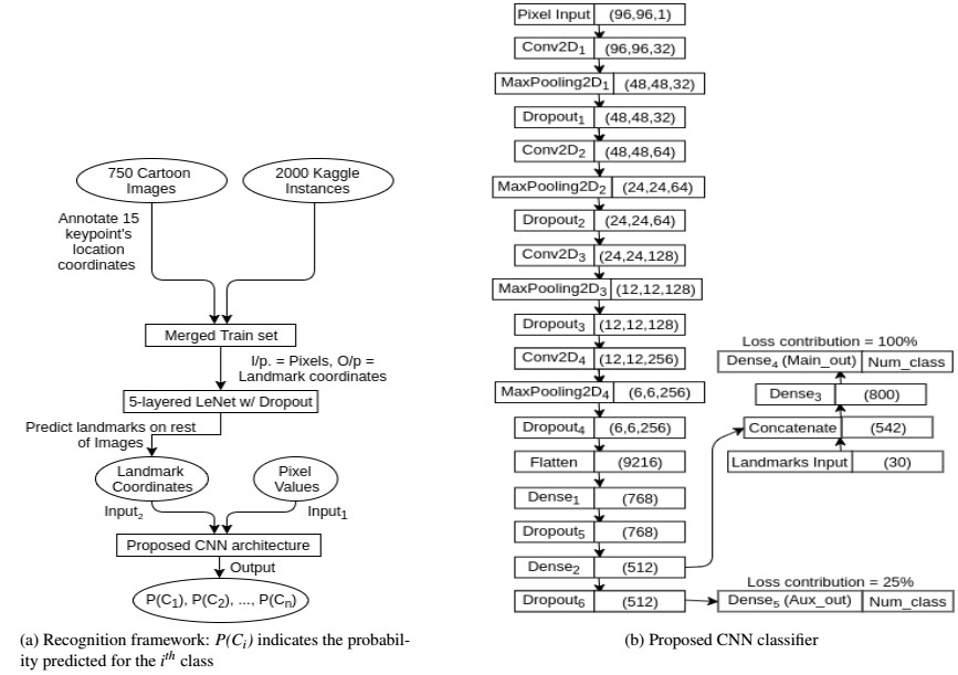 另一种方式利用了建议系统来构建了标志抽取系统,并基于多输入多输出的CNN分类器实现了人脸识别。首先将卡通图像进行灰度和归一化处理,随后对卡通人脸图像的15个特征点坐标进行抽取。在检测过程中,使用了5层的神经网络对特征点进行检测(利用真实的人脸进行了训练,以提高人脸特征检测能力)。最后这一结果和像素处理的结果同时送入到建议人脸识别架构网络中去,通过CNN的多输入多输出结果进行识别。