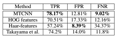 通过对于上述网络的训练后,得到了良好的检测结果。在人脸检测的表现上,作者同时和基于HOG特征及Harr特征的结果进行了比较,在真阳性、假阳性、假阴性的指标都超过了这些方法。