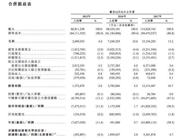 根据小米的招股书显示,小米2017年收入1146.25亿元,经营利润为122.15亿元,净亏损为438.9亿元(但扣除可转换可赎回优先股公允价值变动和向员工发放股份等因素小米2017年净利润53.6亿元)。