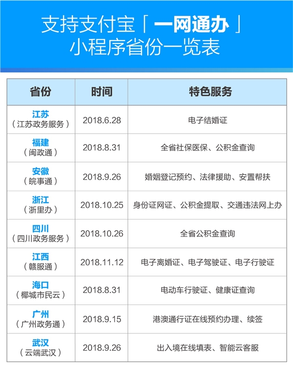 目前,已有江苏、福建、安徽、四川、浙江、江西、广州、武汉、海口9省市的“一网通办”小程序入驻支付宝。