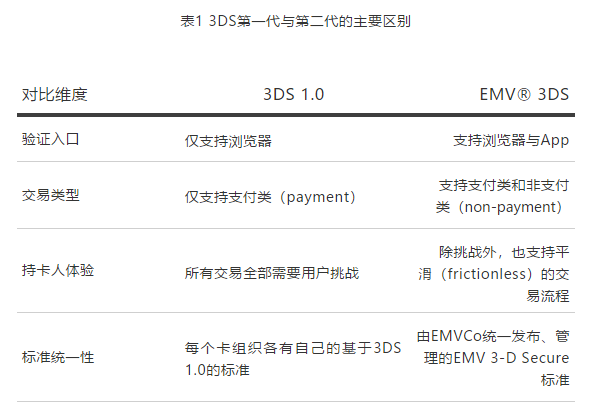Visa于2003年提出3DS第一代版本(3DS 1.0),之后由EMVCo于2016年发布第二代版本(EMV® 3DS)。此次3DS升级带来的变化重点如下表所示: