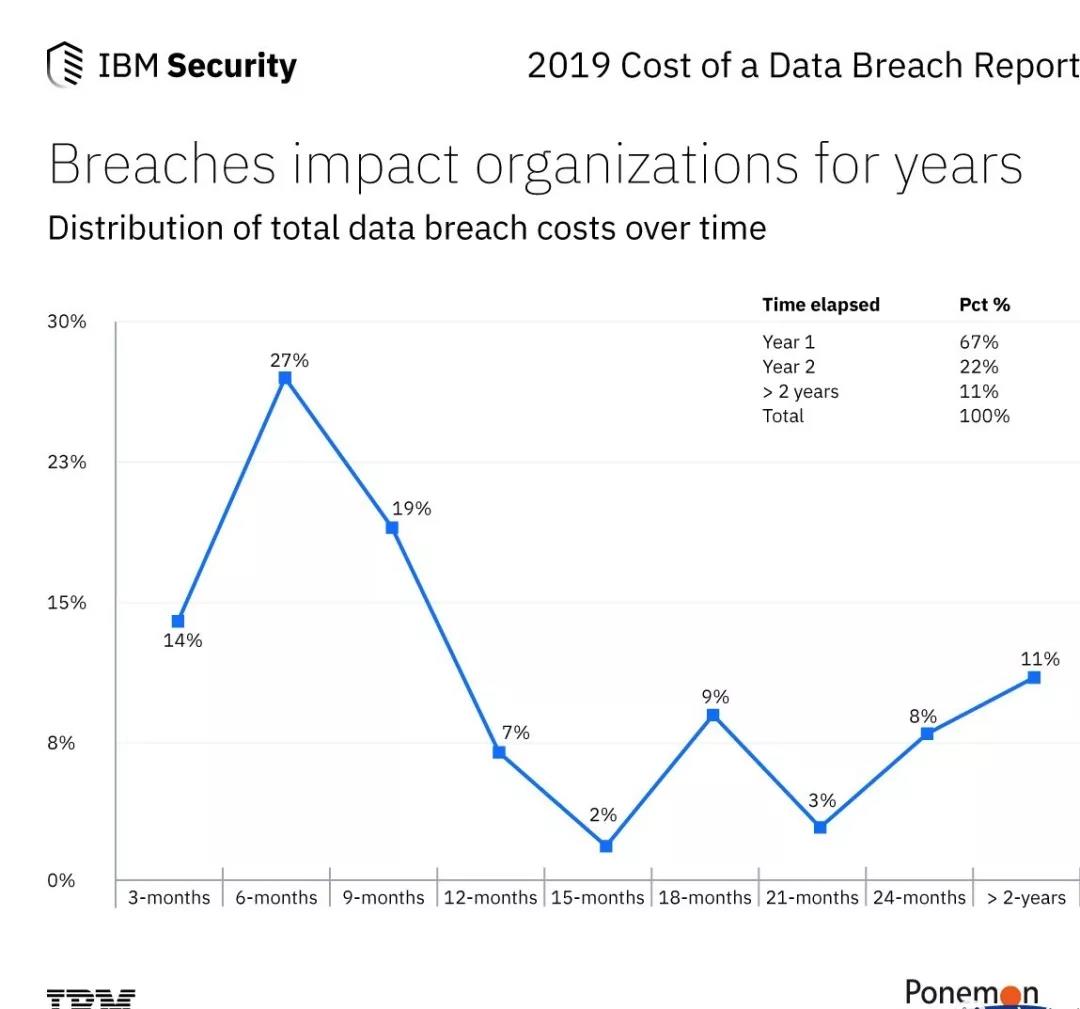 该报告还发现,数据泄露成本通常会在3年内蔓延:平均67%的泄露成本会累计在第一年,22%累计在第二年,11%累计在第三年。