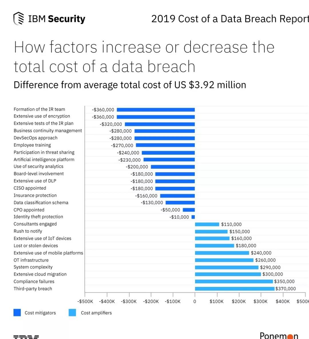 该报告同时还指出,49%的数据泄露事件是源于“无意的人为错误”和“系统故障”(IBM并未对此给予明确定义);这两种行为为组织带来的损失分别为350万美元和324万美元。