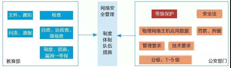 一是对教育部、公安部安全管理的认识。在日常工作中面对教育部和公安部两个部门的检查,为了能减少工作量同时提高效率,山东大学对这两部分的情况做了梳理,如图1所示。学校认识到,等保是核心工作,做好等保安全管理事半功倍。二是对《网络安全法》和等级保护的认识。通过对国家网络安全法和等保制度的深入学习,认识到不做等保后果很严重。三是变被动为主动,积极主动推进等保工作。