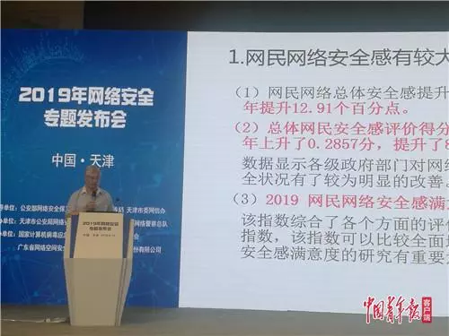 中国青年报客户端天津9月16日电(中国青年报·中青青年网记者 何春中)2019年国家网络安全宣传周于9月16日至22日在全国31个省、自治区、直辖市统一开展,开幕式等重要活动在天津市举行。在天津市举办的2019年网络安全专题发布会上,《2019网民网络安全感满意度调查活动总报告》(以下简称《报告》)及相关专题报告、调查指数发布。《报告》显示,我国网民网络安全感满意度明显提升,但个人信息保护和企业安全责任两指标得分比较低。