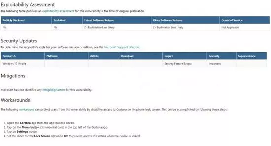 目前已经有工程师成功利用该漏洞访问用户 手机 相册,并在不需要进行系统身份认证的情况下修改和删除照片。该工程师表示:“这个漏洞可以绕过Windows 10 Mobile系统中的安全功能,在锁屏状态下通过Cortana访问文件和文件夹。”而想要利用该漏洞,攻击者需要物理接触到手机并且需要在锁屏界面上启用Cortana。