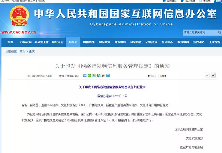 近日,国家互联网信息办公室、文化和旅游部、国家广播电视总局联合印发了《网络音视频信息服务管理规定》,自 2020 年 1 月 1 日起施行。