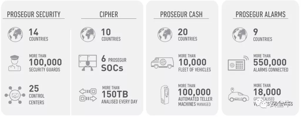 Prosegur 2018 年收入接近 40 亿欧元,在全球 25 个国家经营,业务范围横跨四个关键细分行业(见下图)。