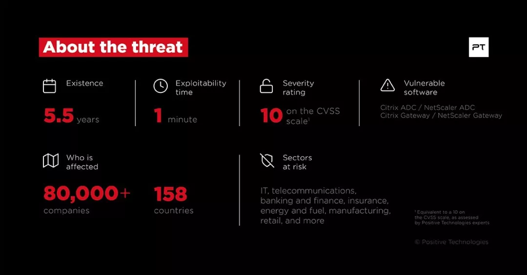 Positive Technologies专家发现Citrix产品存在一重磅级安全漏洞( CVE-2019-19781),利用这个安全漏洞,攻击者不需要访问任何帐户,就能直接访问公司内网 。截止目前,已确定全球158个国家中至少80000家公司面临潜在风险,一场世界级“惊涛骇浪”席卷全球公司。
