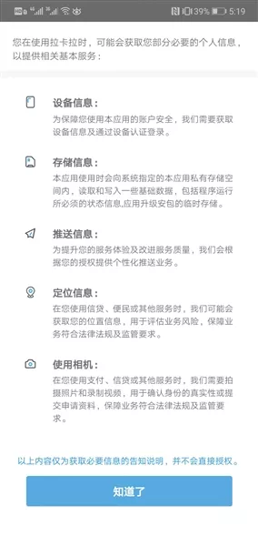 上述金融类APP均在首页对隐私政策进行了弹窗公示,一些APP则对索取权限的理由也进行了解释。如拉卡拉在首次安装打开后便弹窗表示其有可能索取定位、相机权限。其中索取定位权限的目的是用位置信息评估业务风险,而相机则用于身份确认。而招商银行则弹窗提示开启定位权限,目的是提高查询本地城市服务、附近优惠商户的准确性。好分期申请了通讯录与位置权限,其在首页弹窗对申请权限的行为作出解释称,“允许访问通讯录可以有效提升审核效率,允许访问位置可以提升好分期商城体验”。