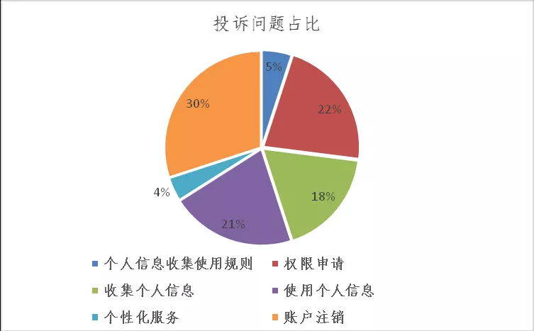 APP用户个人信息安全相关投诉量急剧上升,严重侵犯用户权益、影响产业发展、甚至威胁国家安全。2019年11、12月12321网络不良与垃圾信息举报受理中心共收到用户APP投诉4900余条,投诉内容涉及个人信息收集使用规则、权限申请、个人信息收集、个人信息使用、个性化服务、账号注销等多个方面,其中几类问题尤为突出,账号注销难比例高达到30%,私自共享给第三方比例为21%,不给权限不让用比例为14%,超范围收集个人信息比例为11%,私自收集个人信息比例为7%,过度索取权限比例为7%,频繁申请权限比例为1%。