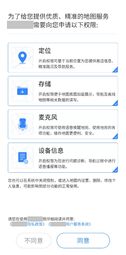 个人信息收集使用规则中应清晰明示申请的设备权限、对应的业务功能、调用权限的目的、询问时机以及用户可否关闭权限等内容,如图10所示。或在应用开启时以弹窗形式对需要申请的核心权限、目的加以明示,如图11所示。