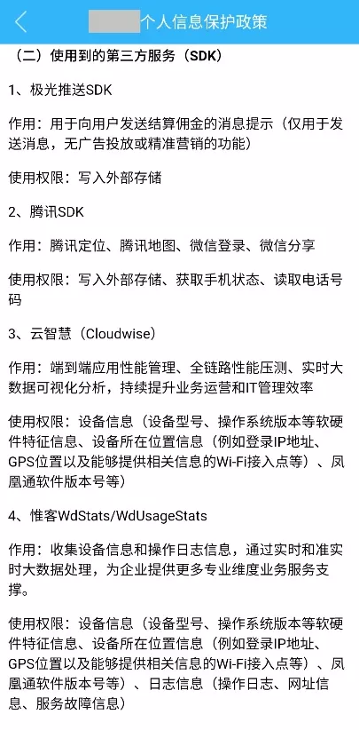 个人信息收集使用规则应添加关于第三方服务的描述,按照业务功能清晰明示提供服务的第三方SDK名称和收集使用的个人信息类型、字段,如图12所示。或按照第三方SDK服务明示其收集使用的个人信息类型、字段和目的等,如图13所示。