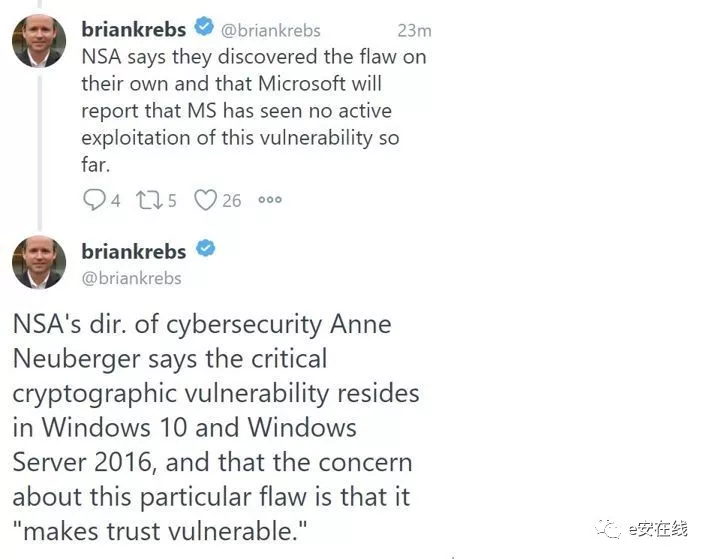 据 Krebs 的 Twitter 消息,美国国家安全局 NSA 首先发现这个漏洞并呈报给微软。