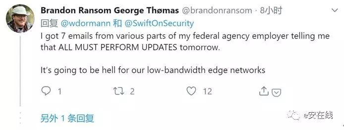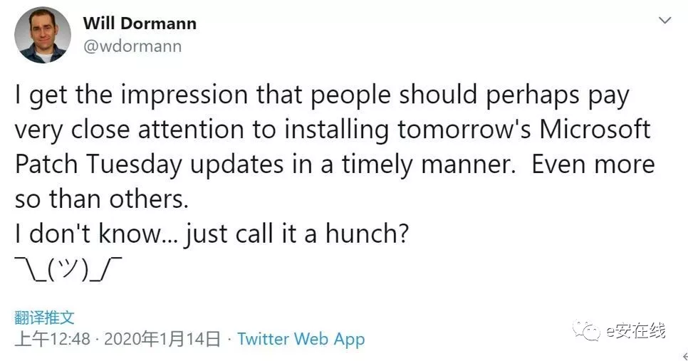 一位提前获知消息的 CERT/CC 的一位漏洞分析师 Will Dormann 发推说:我有预感大家明天要拿出十二万分的热情来更新补丁。