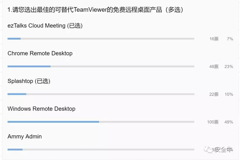 在安全牛的远程桌面工具投票中,Windows Remote Desktop获得了最高票(下图)。显然,RDP依然是IT团队支持远程办公的最爱,但不幸的是近年来RDP的安全隐患正在不断累积。