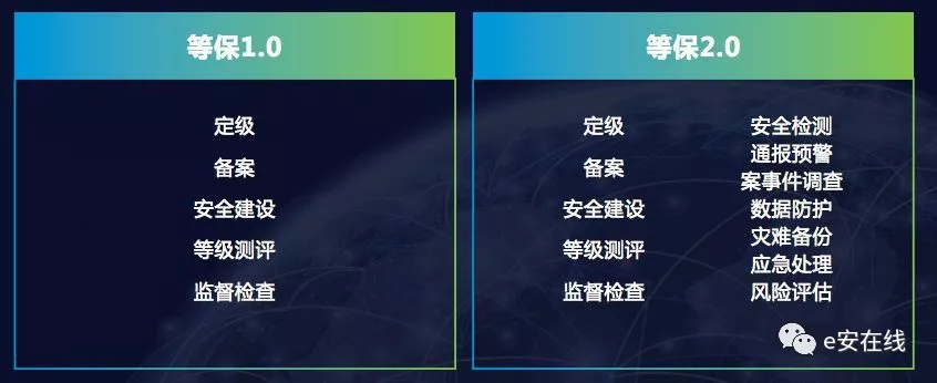等保2.0不仅进一步明确定级、备案、安全建设、等级测评、监督检查等1.0时代的规定动作,最主要的是把安全检测、通报预警、案事件调查等措施都将全部纳入等级保护制度并加以实施。
