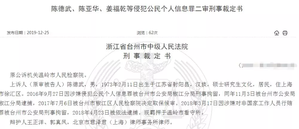 2020年1月3日上午消息,日前,中国裁判文书网公布了《陈德武、陈亚华、姜福乾等侵犯公民个人信息罪二审刑事裁定书》。被告人陈亚华从中国电信全资子公司号百信息服务有限公司数据库获取区分不同行业、地区的手机号码信息提供给陈德武,后者将其在网络上销售,获利累计2000余万元,涉及个人信息2亿余条。