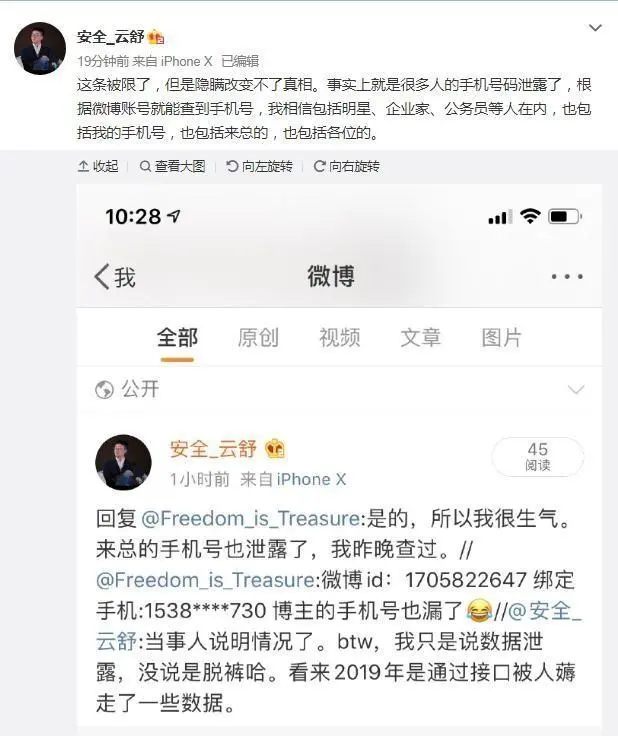 3月19日上午,微博名为“安全_云舒”的用户转发微博时称:“很多人的手机号码泄露了,根据微博账号就能查到手机号……已经有人通过微博泄露查到我的手机号码,来加我微信了。”