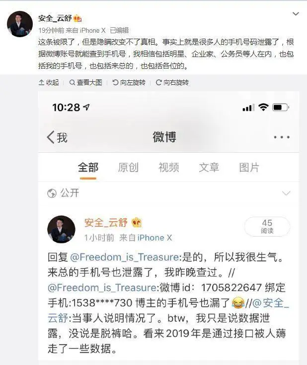 3月19日,微博名为“安全 _ 云舒”的用户转发微博时称:“很多人的手机号码泄露了,根据微博账号就能查到手机号...... 已经有人通过微博泄露查到我的手机号码,来加我微信了。”
