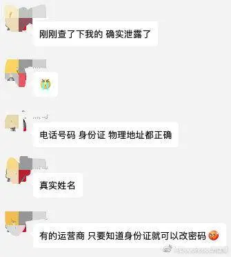在其微博留言中,多名微博网友确认手机号泄露。有一名网友留言,“刚刚查了下我的,确实泄露了,电话号码、身份证、物理地址都正确。”