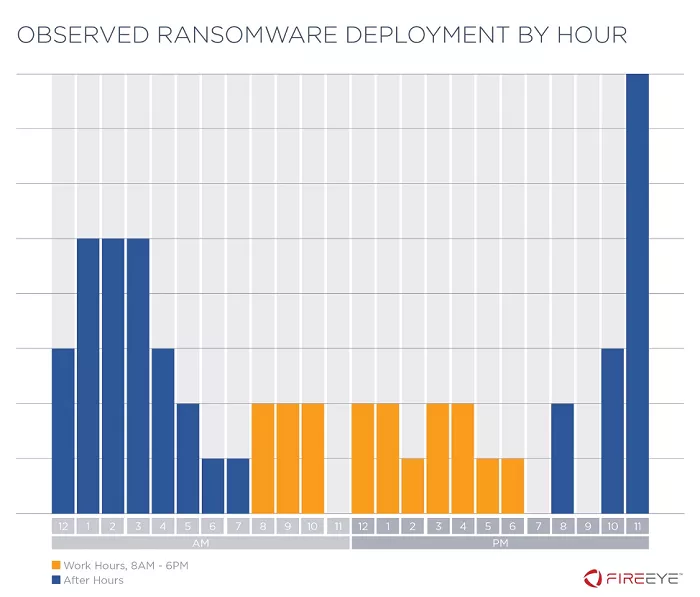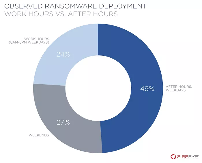 根据网络安全公司 FireEye 发布的最新报告:为了最大程度地提高攻击效率,绝大多数勒索软件都会选择在正常上班时间之外采取行动,以避免被 IT 人员发现并扫除。在 FireEye 调查的案例中,76% 的勒索软件是在周末、或者上午 8 点 ~ 下午 6 点之外的时间段完成部署的。