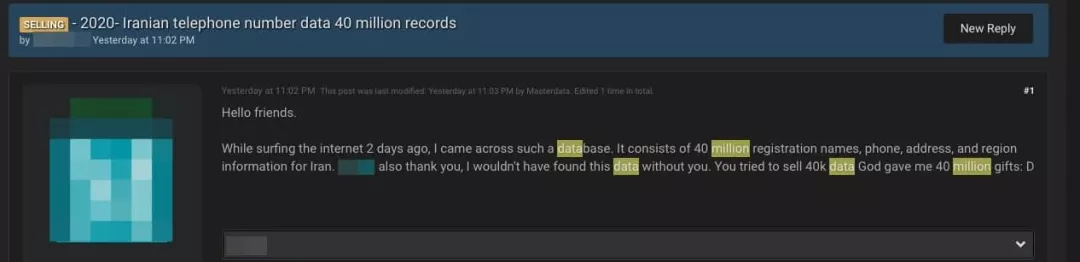 与此同时,研究人员猜测此数据库是由伊朗某个公司通过抓取操作创建的,然后将其出售给第三方组织。对此,研究人员还透露,几天前Elasticsearch服务器上的错误配置数据库由于被蠕虫攻击,其中特定数据也被删除。然而,在攻击之前,这个数据库中的数据就已经被下载了好几次,其中一个下载者正在著名的黑客论坛上出售该数据,目前还不清楚有多少人购买了此数据库。