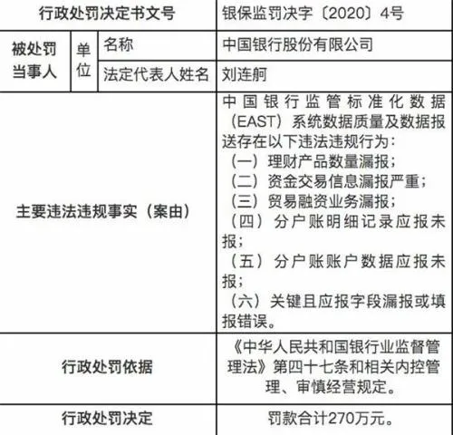2020年5月9日,中国银保监会披露一批罚单,包括6家国有大行,2家股份制银行在内的8家银行被罚了1770万元。被罚原因是,监管标准化数据(EAST)系统数据质量及数据报送存在违法违规行为,比如理财产品数量漏报、资金交易信息漏报严重等。