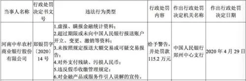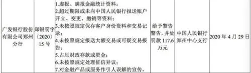 罚单显示,河南中牟农村商业银行因虚报、瞒报金融统计资料;超过期限或未向中国人民银行报送账户开立、变更、撤销等资料;未按照规定报送大额交易或可疑交易报告等6项违法违规行为被处罚115.2万元。广发银行郑州分行因虚报、瞒报金融统计资料;超过期限或未向中国人民银行报送账户开立、变更、撤销等资料;未按照规定报送大额交易或可疑交易报告等7项违法违规行为被处罚款117.6万元。