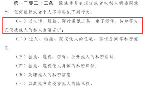 其中第1033条明文规定,除法律另有规定或权利人明确同意外,任何组织和个人不得以电话、短信、即时通信工具、电子邮件、传单等方式侵扰他人的私人生活安宁。
