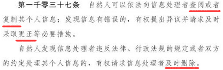 值得注意的是,第1037条规定,自然人具有对自己个人信息的查阅权、复制权以及更正权,当发现信息处理者违反法律法规或双方约定时,具有删除权。