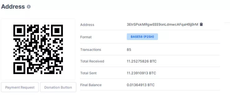 该地址已收到 84 笔交易,总金额为 11.23 BTC,价值 109658.14 美元。