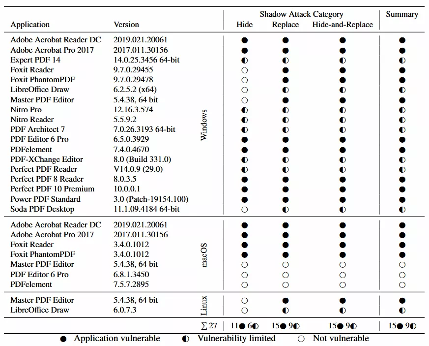 根据最新研究,易受攻击的应用包括AdobeAcrobatPro、AdobeAcrobatReader、PerfordPDF、FoxitReader、PDFElement等。PDF]本周由德国波鸿鲁尔大学的学者出版。
