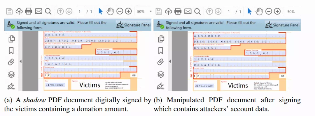 他们的新阴影攻击不同于他们的第一次攻击,因为它不篡改数字签名,作为第一次攻击,而是使用PDF的内容而不破坏签名。