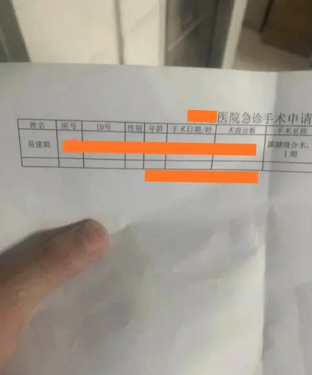 但是,8月16日晚间,某著名篮球论坛上,一张易建联的手术申请单被网友晒出,易建联的姓名、术前诊断、手术日期、年龄、手术名称和主治医生都被曝光。更过分的是,易建联的床号信息也被同时曝光了。(小编对原照片中的部分信息作了遮挡处理)