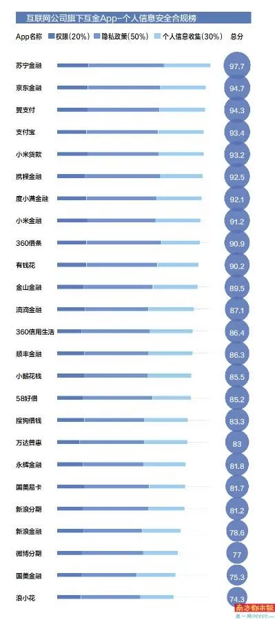 结果显示,互联网综合性生活服务App上的嵌入型金融服务端口普遍存在隐私条款缺失的情况,个人信息收集的规范性有待加强;而25个独立App中,国美、新浪系App安全问题暴露明显,排名垫底。