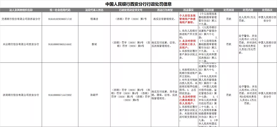 2)兴业银行股份有限公司西安分行,由于未及时停用已离岗工作人员用户,违反《个人信用信息基础数据库管理暂行办法》第三十九条等规定,被处人民币37.5万元罚款。并对该机构1名相关责任人员处1万元罚款。