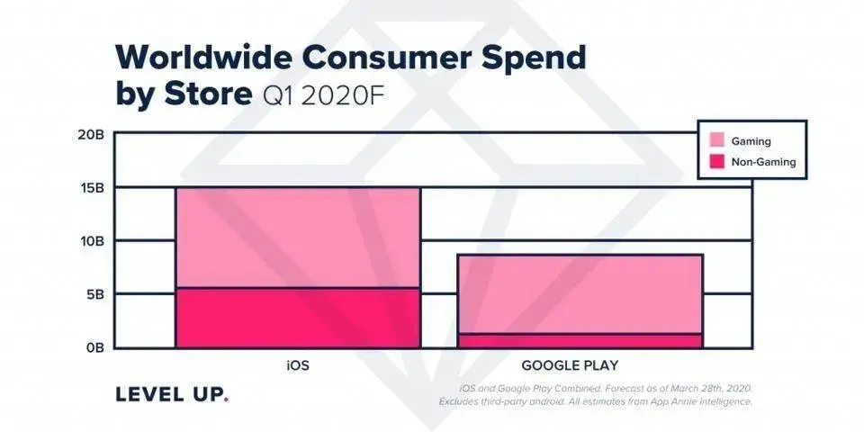 2020 年第一季度,iOS 应用市场规模高达 150 亿美元,差不多相当于安卓的两倍。考虑到 Facebook 和谷歌在 iOS App 里投放的广告有一大部分都是游戏广告,这部分业务对两家公司至关重要。