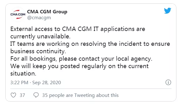 CMA副总裁Joel Gentil稍早在一份声明中称:“CMA CGM集团(不包括CEVA Logistics)目前正在应对针对外围服务器的网络攻击。"