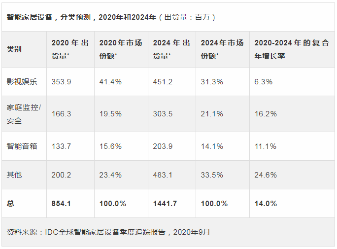 据国际数据公司(IDC)发布的《全球智能家居设备季刊》数据显示,2020年全球智能家居设备市场预计将同比增长4.1%,总出货量将超过8.54亿部。随着人们消费能力增强并继续投资于家庭自动化设备和服务,预计2024年全球出货量将超过14亿,5年复合年增长率(CAGR)将达到14.0%。