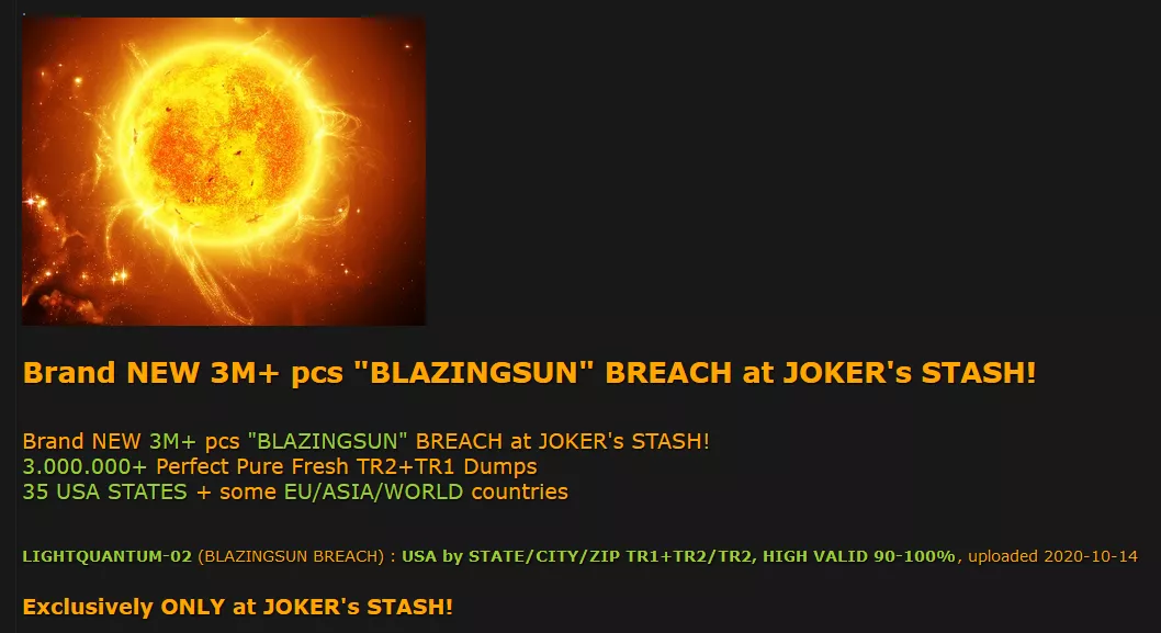 本周早些时候Gemini Advisory发现网络犯罪分子在宣传名为“炽热的太阳”(Blazing Sun)的大量支付卡信息,Gemini Advisory注意到这次入侵。在与几家金融机构合作后,Gemini Advisory的发现得到了证实。