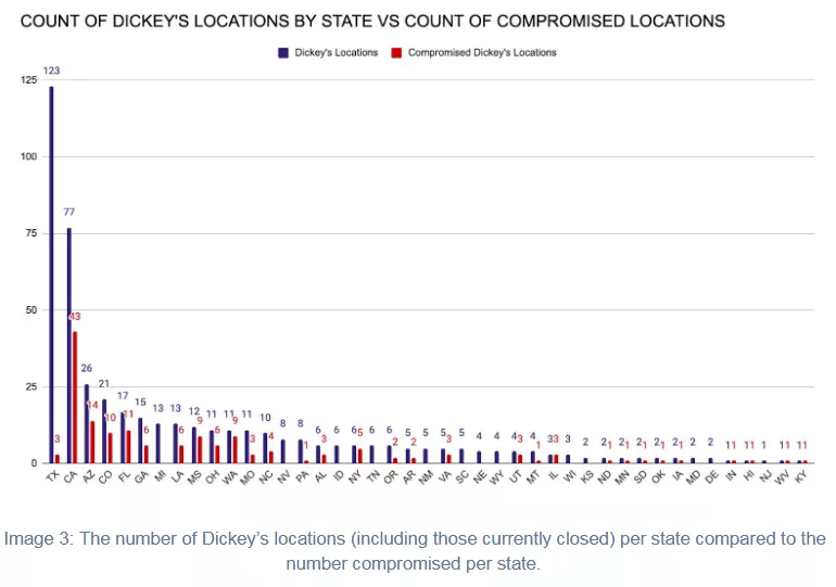 Gemini Advisory 表示,这些数据大概是黑客入侵了迪基餐厅使用的店内POS系统后获得的。黑客似乎已经入侵了迪基公司469个地点中的156个,被入侵的餐馆分布在美国的30个州;曝光率最高的地区是加利福尼亚州和亚利桑那州。