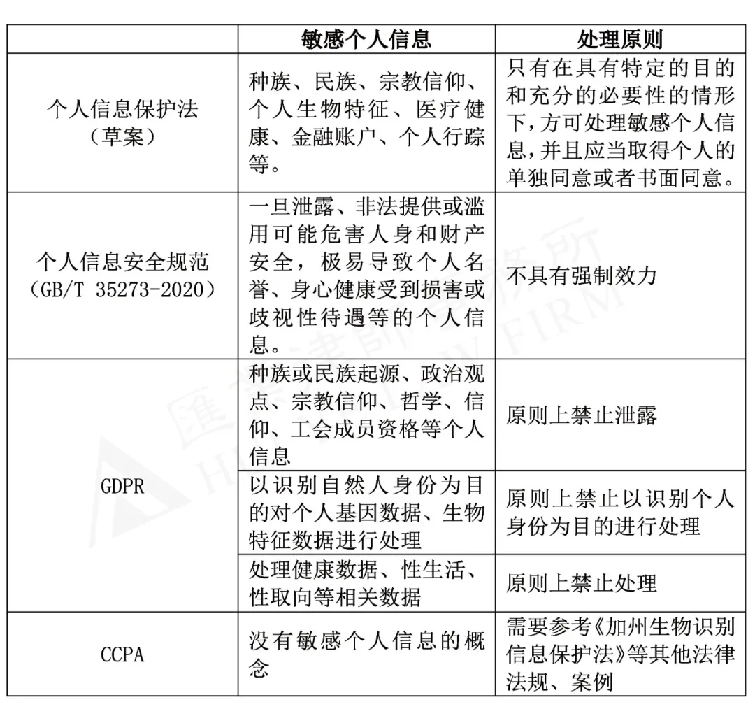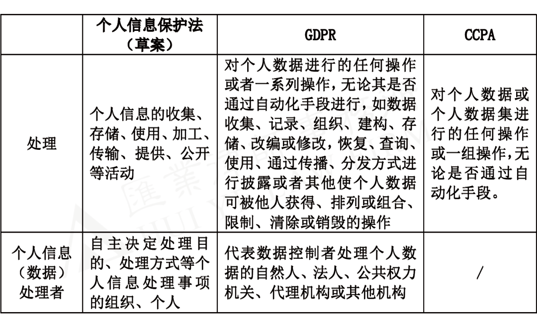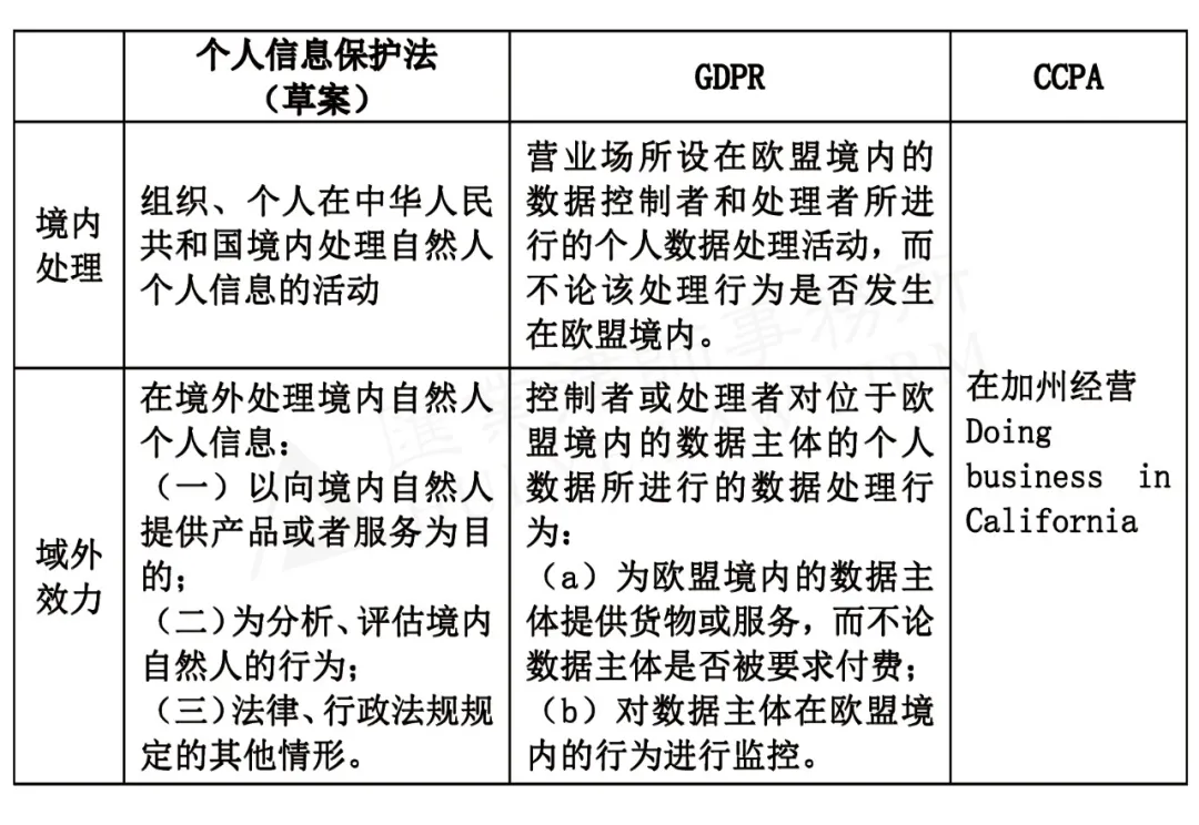 在保护范围上,《个人信息保护法(草案)》与GDPR基本保持一致,关注自然人个人信息的保护,不仅局限于消费者或网络空间。而CCPA从法律名称就能发现规制的重点在于消费者个人信息的保护,该法并不关注其他如劳动用工的领域的个人信息。