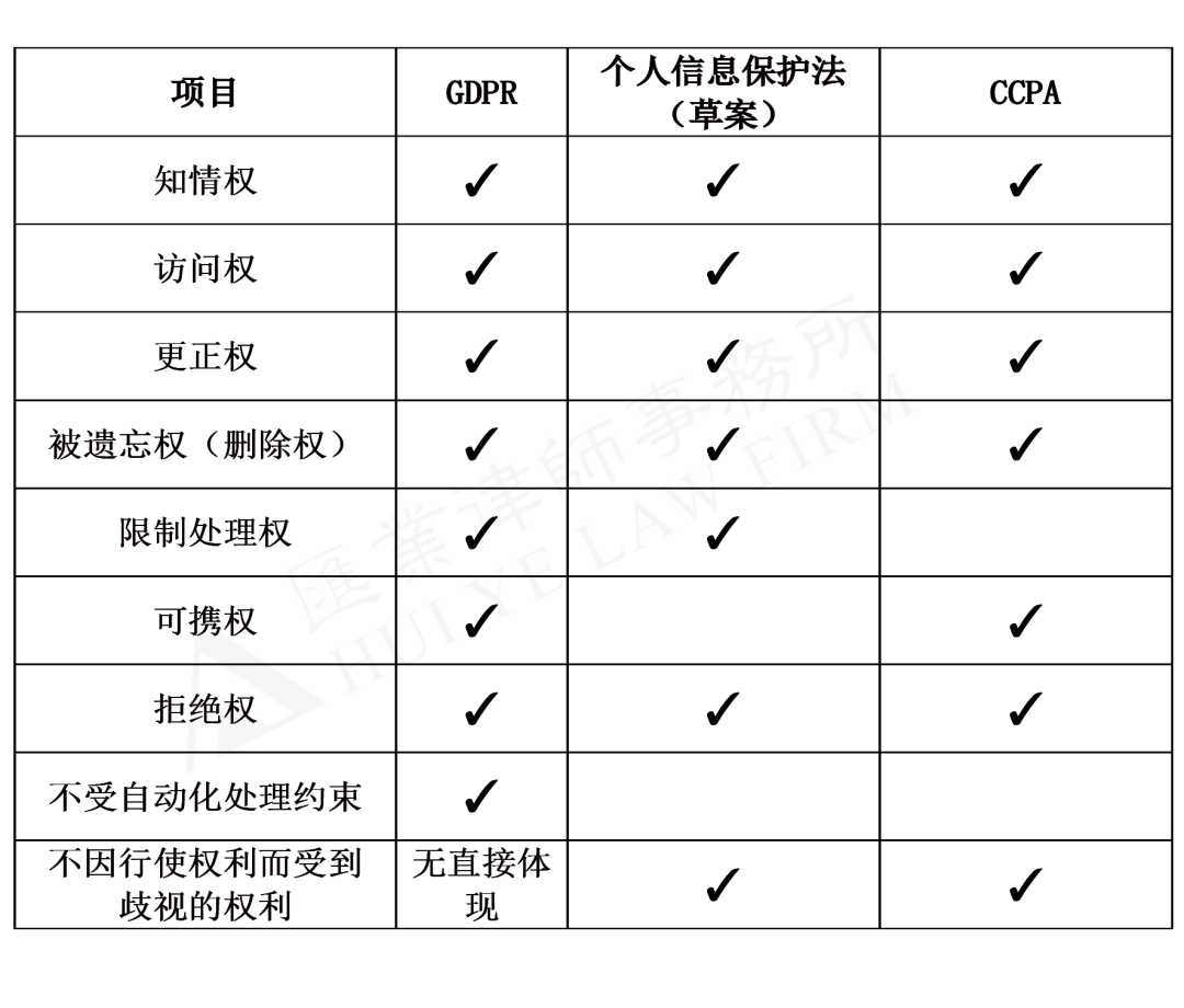 在《个人信息保护法(草案)》中,延续了《民法典》查阅权、复制权、更正权、删除权的规定并进行了细化,还设立了知情权、决定权、限制与拒绝处理权、解释说明权等权利,更加接近GDPR与CCPA等国际主流数据保护法律的权利配置: