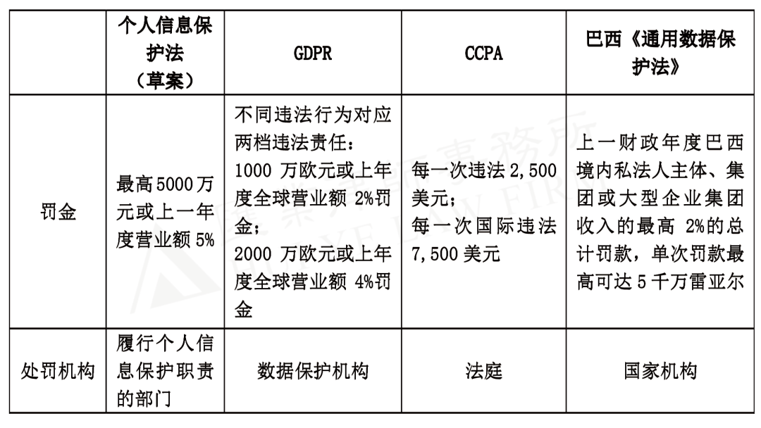 在法律责任方面,《个人信息保护法(草案)》罕见设置了高额的罚金,最高5000万元或上一年度营业额5%的高额罚款,即使是放到国际上进行比较也算得上具有“震慑力”。当然草案同样保留了暂停业务、停业整顿等具有威慑力的处罚方式。
