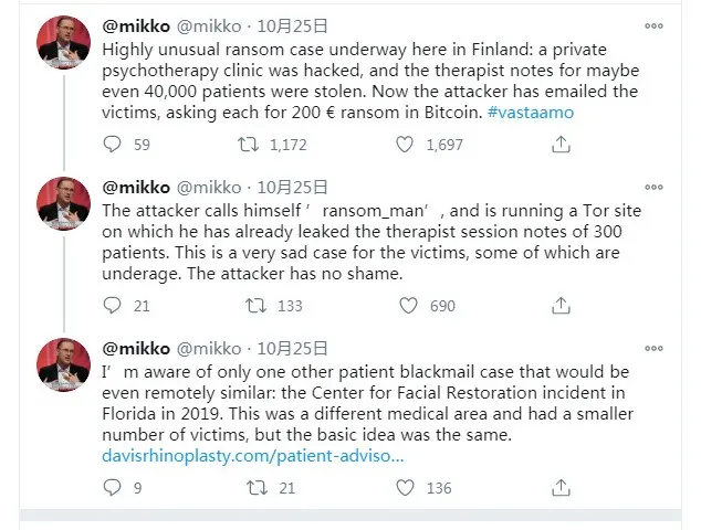 芬兰网络安全公司F-Secure的首席研究官米科•海波宁(Mikko Hypponen)在一条推文中写道:“对受害者来说,这非常令人悲哀,其中一些受害者还未成年。攻击者一点都不知羞耻。”他指出,袭击者称自己为“ransom_man”(赎金人)。